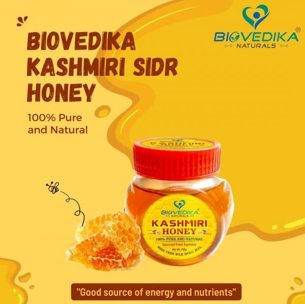 Biovedika Kashmiri Honey (Sidr Honey) is sourced directly from Kashmir and made by Wild Small Bees giving it a unique nutritional value and taste apart from enormous medical benefits. Sidr honey is sought after because of its exquisite tastes, health benefits as natural medicine, and even as an aphrodisiac. Genuine Manuka honey and Sidr honey are considered medical-grade honey because their medicinal benefits are far greater than that of your standard table honey. Sidr honey (known as Middle East’s manuka honey) is an established remedy and is far more potent than manuka honey. Sidr honey is monofloral honey made solely from the nectar of Sidr trees also known as Jujube or Berry in Kashmir. Sidr tree is used medicinally from bark to berries, and the antibacterial Sidr honey is expensive due to its wide medical uses. In addition to their many medicinal uses, Sidr berries are also extremely nutritious — something passed down to the honey as well, thanks to the rich soil in the region. Whether you use Biovedika Kashmiri Honey medicinally or nutritionally, you’ll get a superior product with a superior flavour.